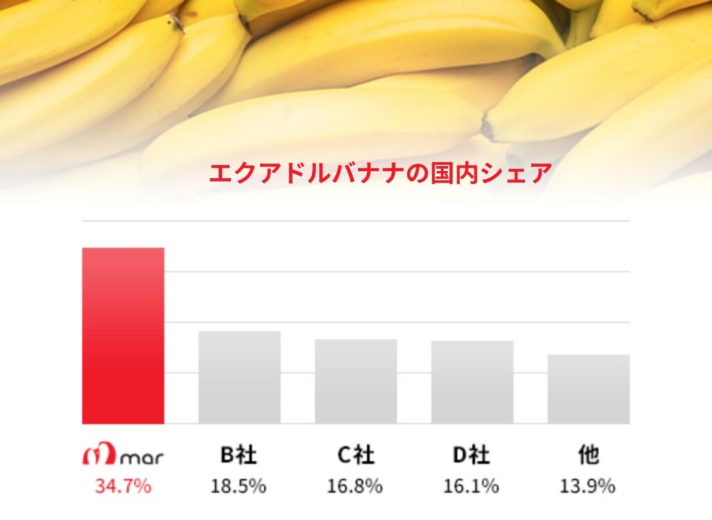 2023年1~3月の日本のバナナ輸入統計によればフィリピン86%、その他の国14%、その他の国の内訳はエクアドル6%、メキシコ5%、その他3%。エクアドルのシェアは当社がトップで34.7%。当社を含む4社で実に86.1%を占めます。